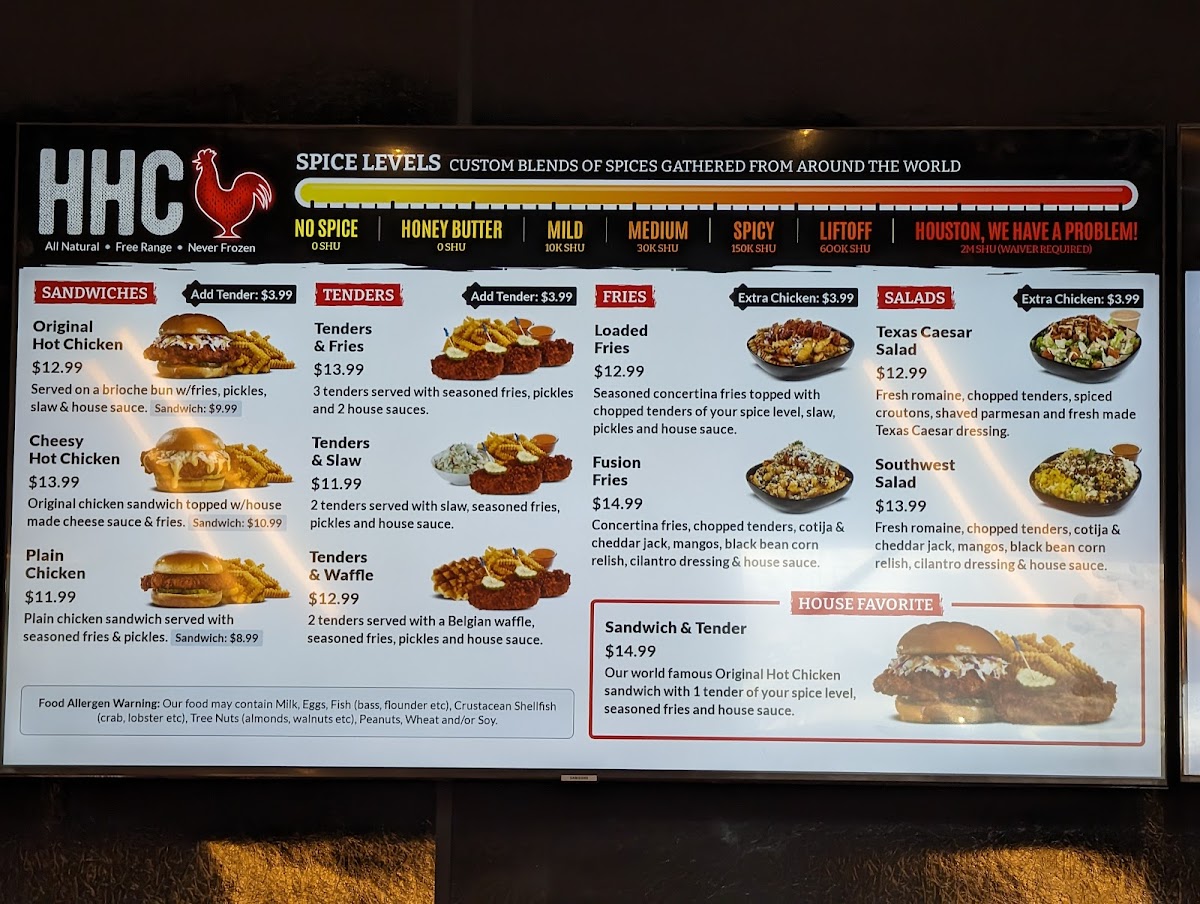 The menu boasts an array of salads, including the hearty Texas Caesar and the vibrant Southwest Salad, catering to a variety of palates. Each chicken option allows you to choose your preferred spice level, ensuring crispy, juicy bites that pack a flavorful punch.